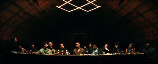 Zu Cams Medientraining gehört auch die Teilnahme an Illuminati-Fotoshootings. Hier stellt er das letzte Abendmahl nach, bei dem er Jesus ersetzt.