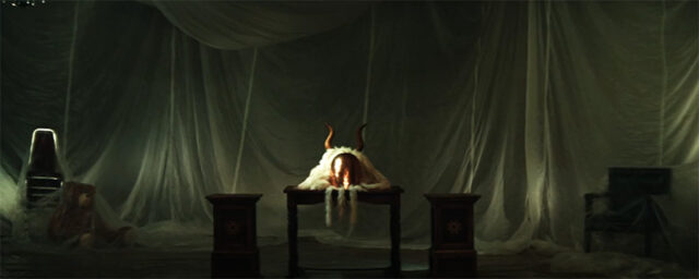Während der Veranstaltung betritt Cam einen Raum, in dem zwischen zwei „Freimaurer“-Säulen ein gehörnter Helm steht.