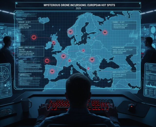 • Dänemark (26.–28. Sept.): Drohnen tauchten erneut über Flughäfen und militärischen Küstenzonen auf. Zeugen berichteten von Formationsflügen und blinkenden Lichtern.