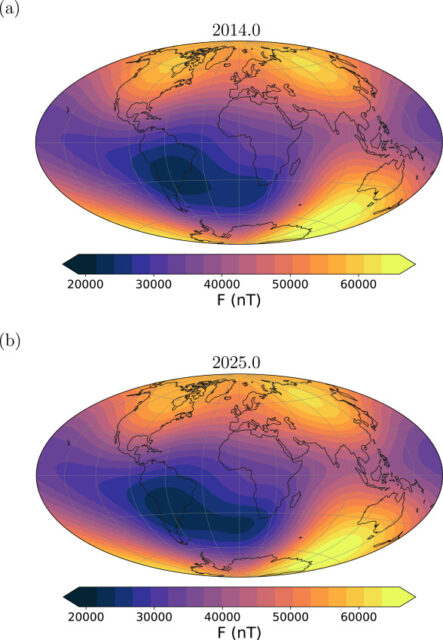 Eine der meistdiskutierten Eigenschaften des Erdmagnetfelds ist die Südatlantische Anomalie. Dabei handelt es sich um eine Region über dem Atlantik, in der das Magnetfeld besonders schwach ist.