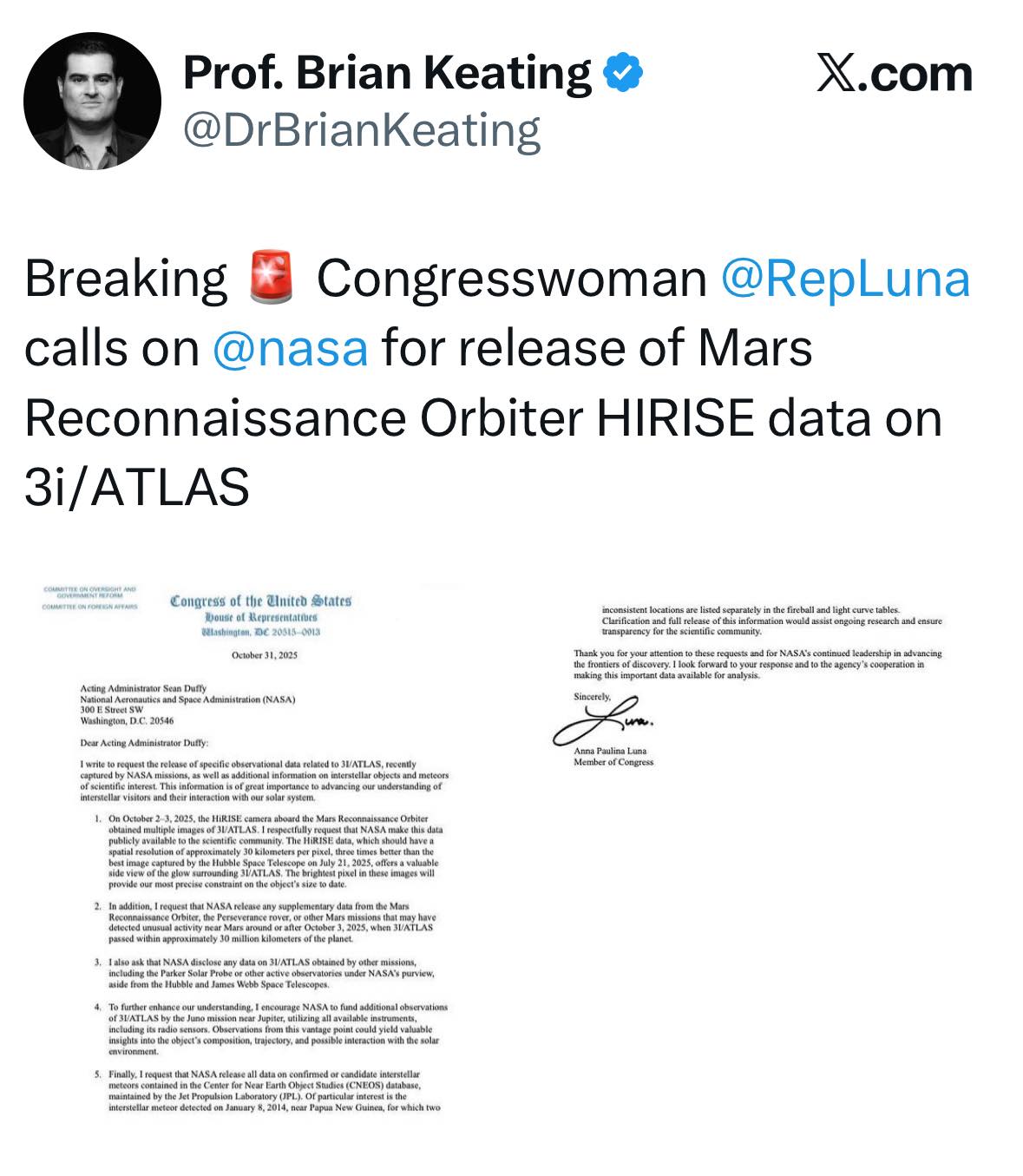 Sogar der Kongress ist genervt von den Verschleierungstaktiken der NASA, mit denen sie Informationen über 3i/Atlas zurückhält. 👊🏻👀