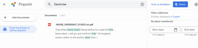 Der Aufsichtsausschuss des Repräsentantenhauses veröffentlichte letzte Woche mehr als 23.000 Dokumente im Zusammenhang mit dem verurteilten Sexualstraftäter Jeffrey Epstein, darunter Dokument 015032, in dem Icke zum ersten Mal in den Jeffrey-Epstein-Akten erwähnt wird, und zwar kryptisch mit der Aussage:
