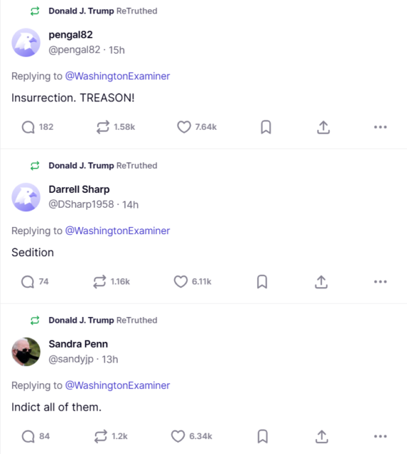 Der Präsident teilte außerdem eine Reihe von Beiträgen zufällig ausgewählter Nutzer von Truth Social, die den Aufruf der Demokraten zum Handeln kommentierten.