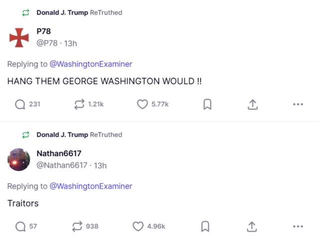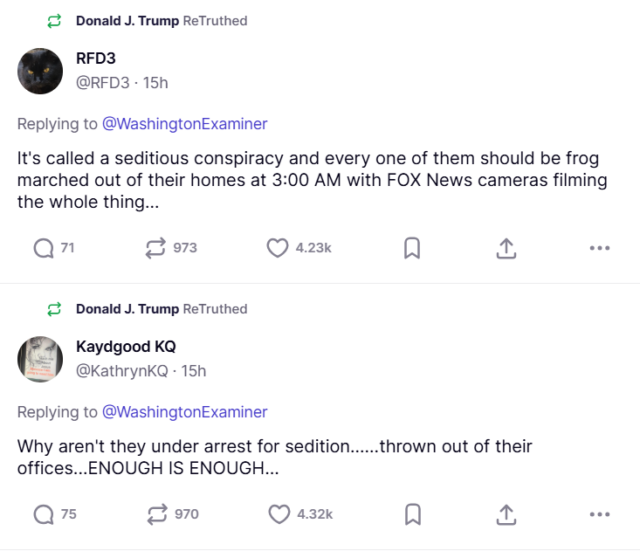 „Aufrührerisches Verhalten, bestraft mit dem Tod!“, schrieb Trump als Reaktion auf einen Artikel des Washington Examiner, in dem es um die Demokraten ging, die Soldaten und Geheimdienstmitarbeiter zu Befehlsverweigerung anstifteten.