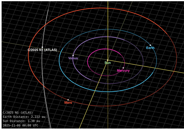 Titelbild: Flugbahn von 3I/ATLAS mit den Positionen der Planeten am 6. November 2025. (Bildnachweis: NASA/JPL )