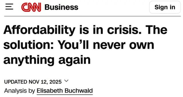 CNN ist der jüngste Übeltäter mit einer Schlagzeile, die es auf den Punkt bringt: „Die Erschwinglichkeit steckt in der Krise. Die Lösung: Sie werden nie wieder etwas besitzen.“