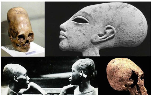 Abb. 56: Oben links: Ein länglicher Schädel aus Paracas, Peru. Oben rechts: Dieser weibliche Kopf hat einen länglichen Schädel und ist wahrscheinlich ein Kind des ägyptischen Pharaos Echnaton (1351–1334 v. Chr.). Unten links: Sklavinnen im Kongo, deren Köpfe in jungen Jahren durch Fesseln verlängert wurden, ca. 1900–1915. Unten rechts: Länglicher Schädel einer jungen Frau, ausgestellt im Historischen Museum von Yverdon