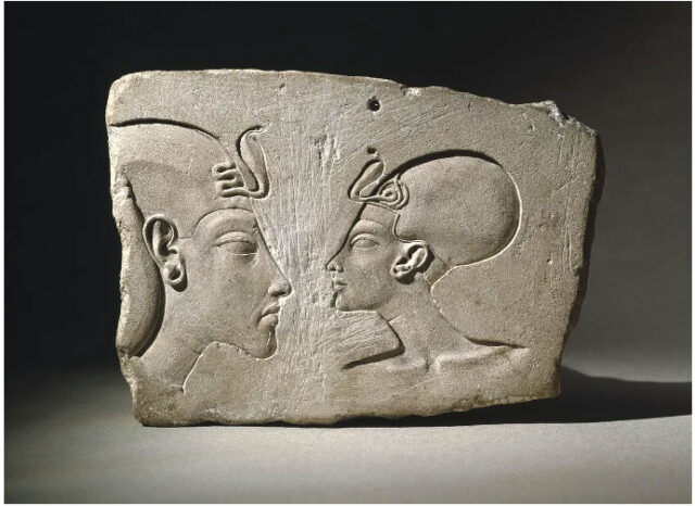 Abb. 58: Die Wilbour-Plakette, ca. 1352–1336 v. Chr., zeigt Echnaton und Nofretete in der Spätphase ihrer Herrschaft
