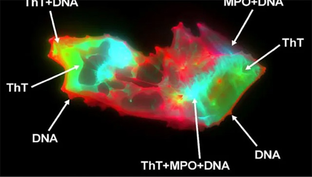 Forscher identifizierten Mikrothromben mithilfe von Thioflavin-T (ThT) , einem amyloidbindenden fluorogenen Farbstoff. Die ThT-Positivität war das entscheidende Kriterium. Eine Struktur wurde nur dann als Mikrothrombus gewertet, wenn sie ThT band.
