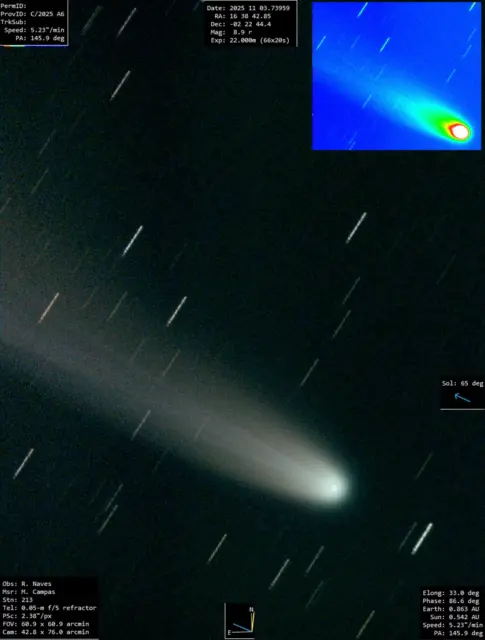 Das Bild des Kometen Lemmon aus dem Sonnensystem, aufgenommen am 3. November 2025 vom R. Naves Observatorium, zeigt einen deutlichen Kometenschweif, der von der Sonne wegführt.