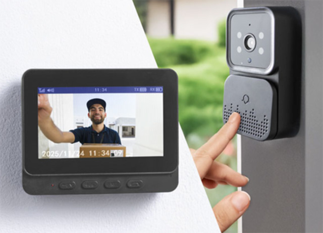 Mit dieser kabellosen Video-Türklingel wissen Sie jederzeit, wer vor Ihrer Tür steht. Dank Farbdisplay, Nachtsicht und Gegensprechfunktion behalten Sie nicht nur die Kontrolle, sondern auch den Komfort – ganz ohne Verkabelung.