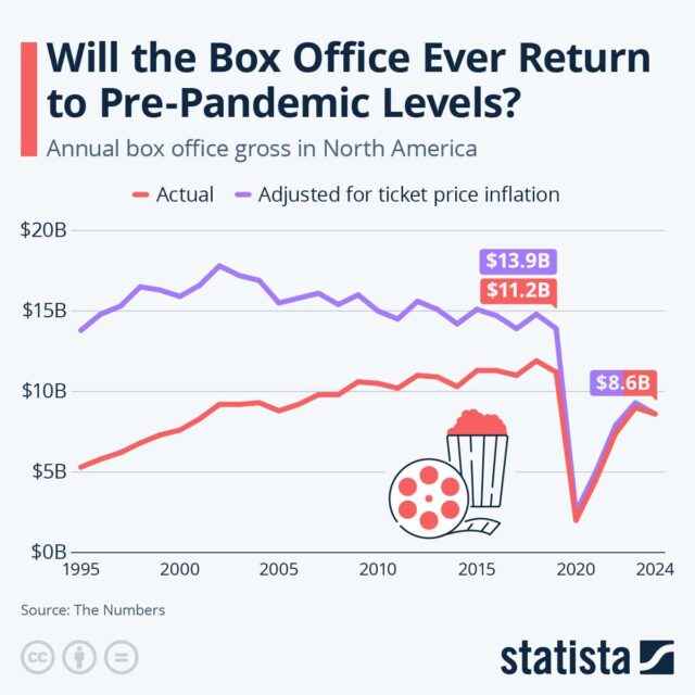 Ein Produktionsrückgang in Hollywood und Los Angeles deutet auf einen allgemeinen Niedergang der Filmindustrie hin. Dieser Einbruch fällt mit dem allgemeinen Rückgang der Kinoeinnahmen seit 2019 zusammen.