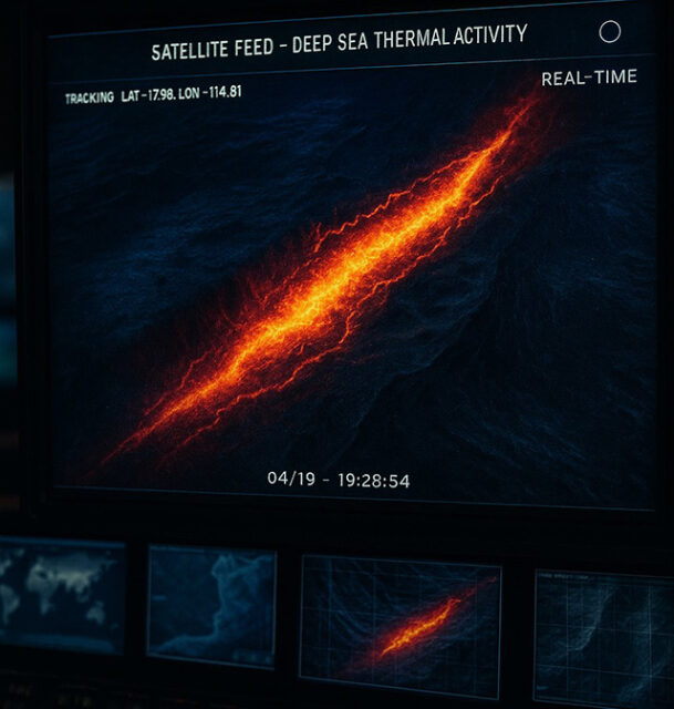 Regierungssatelliten beobachten eine gewaltige Bewegung unter dem Meeresboden – eine so starke Wärmesignatur, dass sie Tiefseesensoren wie ein Unterwasserfeuer erhellt. Von Dennis Donathan