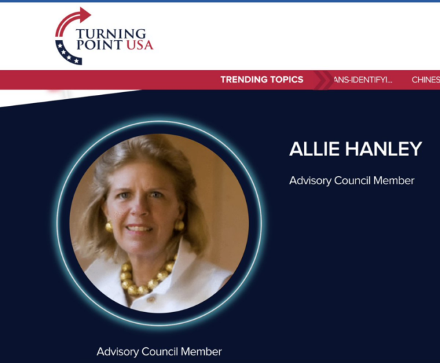Wir haben von Insidern bei TPUSA die Bestätigung erhalten, dass Allie Hanley 2018 bei einer Veranstaltung von Turning Point UK an der Vorstellung von Owens und Farmer beteiligt war.