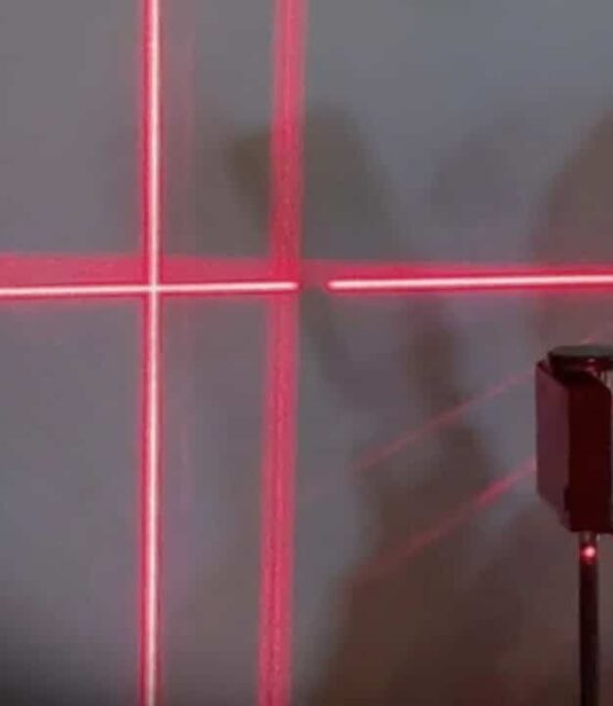 2. Man stelle den Laser auf einen Tisch, z.B. in einer Entfernung, in etwa 1-2 Meter Entfernung, zu einer weißen Wand. Es sollte ein Kreuzlaser sein. Diesen kann man selbst herstellen oder bei Danny Goler kaufen.
