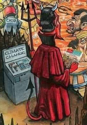 Die Aussagekraft des obigen Bildes ist verblüffend. Es suggeriert, dass der „Klimawandel“ ein künstliches, ferngesteuertes Ereignis ist, das vom Teufel persönlich gelenkt wird. Und erstaunlicherweise hält der Teufel genau diese Ausgabe des Economist in Händen, als wäre sie sein „Meisterplan“.