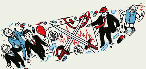 Die rote Linie im Diagramm markiert einen historischen Tiefstand. Stellt sie den Wert des US-Dollars (um das Diagramm herum sind Cent-Münzen zu sehen), den Aktienmarkt oder die allgemeine Wirtschaftslage dar? Die beiden Schwerter über dem Diagramm deuten darauf hin, dass die negativen Werte auf Handelskriege zurückzuführen sein könnten. Zu beiden Seiten des Diagramms befinden sich Staatsoberhäupter wie Xi Jinping und Trump, die allesamt in einer schwierigen Lage zu sein scheinen und um ihren Machterhalt kämpfen.