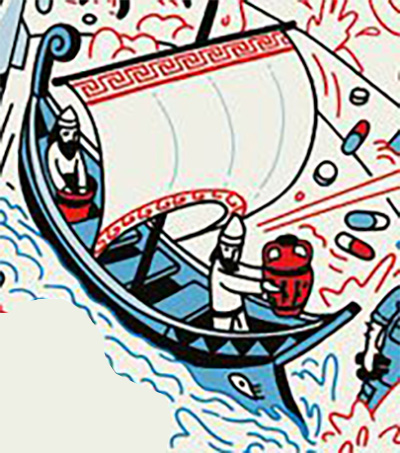 Einige visuelle Merkmale deuten darauf hin, dass es sich bei dem Boot um ein Trimeme einer antiken Mittelmeerkultur handelt, etwa aus dem alten Sumer oder Phönizien. Diese Kulturen schmückten ihre Boote oft mit Augen, um das Böse abzuwehren und ihnen ein übernatürliches Bewusstsein zu verleihen, damit sie Gefahren entgehen konnten.