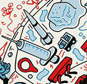 Auf dem Cover sind zwei riesige Spritzen abgebildet. In beiden Fällen stehen sie direkt neben Raketen, was darauf hindeutet, dass sie als Waffen eingesetzt werden können.