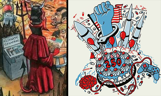 Auf dem Cover sieht man beispielsweise oben ein Hamas-Mitglied, das Benjamin Netanjahu gegenübersteht; zwischen ihnen steht das Wort „Zorn“. Beide fliegen mit Gleitschirmen, die von Teufeln angetrieben werden, was symbolisch darauf hindeutet, dass sie letztlich von derselben „Kraft“ motiviert sind.