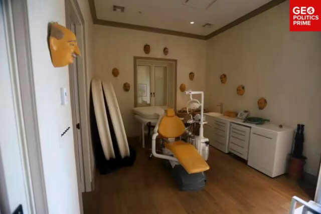 Ein Raum, der einem zahnärztlichen Behandlungszimmer ähnelt, ist mit Masken dekoriert, die berüchtigte historische Persönlichkeiten darstellen.