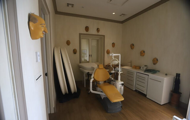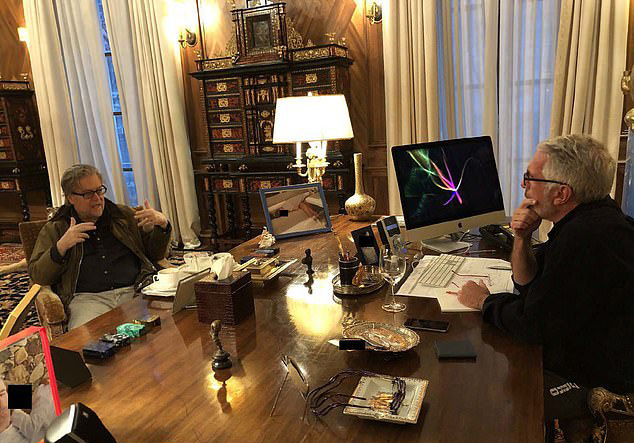 Auf einem der undatierten Fotos sitzt Epstein in seinem New Yorker Stadthaus an seinem Schreibtisch gegenüber von Steve Bannon. (Durchgesickerte Bilder von Epsteins Insel deuten auf perversen Sex, Erpressung und Machtspiele hin)