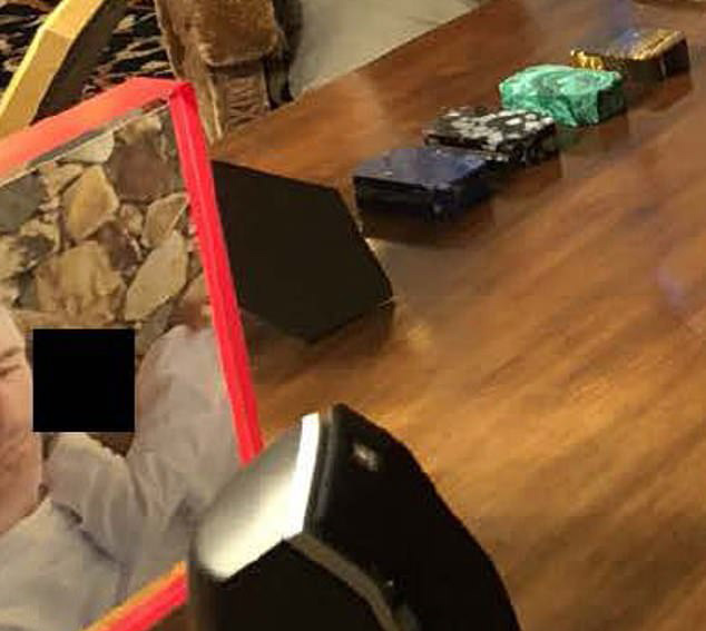 Auf Epsteins Schreibtisch sind zwei weitere Fotos zu sehen, beide mit schwarzen Kästchen versehen, um die Identität der darauf abgebildeten Personen zu schützen.