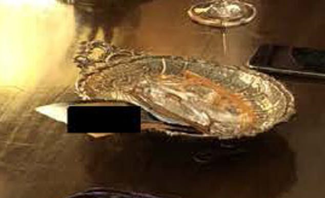 Das dritte Bild liegt auf einem Teller nahe der linken Hand des Pädophilen. Man kann nicht erkennen, was das Foto zeigt, aber der schwarze Rahmen darüber deutet darauf hin, dass es mindestens eine Person enthält, deren Identität geschützt wird.