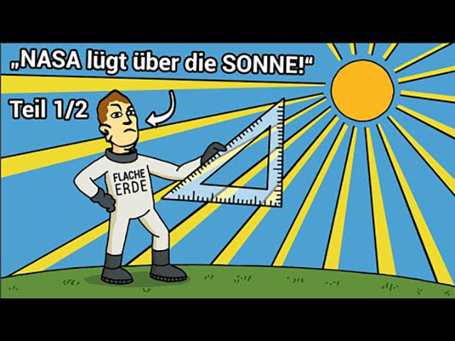 Auch mit den Größenverhältnissen der Planeten stehen Flacherdler offenbar auf Kriegsfluss. etwa bei der Darstellung von Sonne und Erde. Für Flacherdler Peter ist beispielsweise das Größenverhältnis von Sonne und Erde ein Buch mit sieben Siegeln. Peter vergleicht in seinem Video die Erde mit einer Kirsche und die Sonne mit einem Medizinball. Flo: