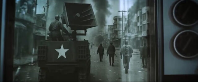 Die Spannung steigt schlagartig an. Flugblätter mit arabischer Schrift fallen aus einem Flugzeug. Ein Soldat fährt in einem Panzer, der mit einem riesigen Lautsprecher ausgestattet ist, aus dem verzerrte Botschaften dröhnen.