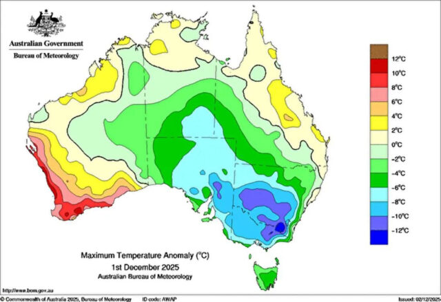 Australien scheint nun seine Abkühlung bis in den Dezember hinein fortzusetzen, zumindest im Osten. Eine winterliche Kältewelle erfasste am Montag Victoria, New South Wales und Teile von Queensland und sorgte für die niedrigsten jemals dort gemessenen Sommertemperaturen.