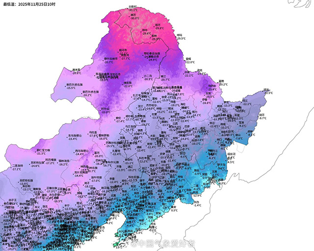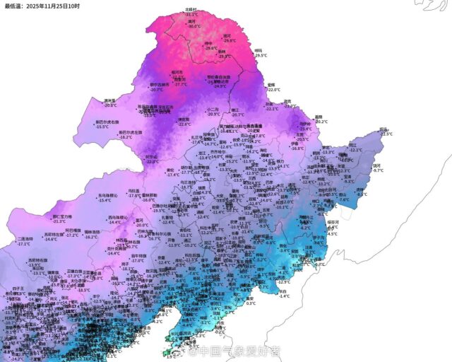 Die Tagestemperaturen sind extrem niedrig. Der größte Teil des Nordostens bleibt selbst zur Mittagszeit unter 0 °C, während Huzhong, Tahe und Xinlin den ganzen Tag über unter -15 °C bleiben – weit unter den für Ende November typischen Höchstwerten von etwa -5 °C.