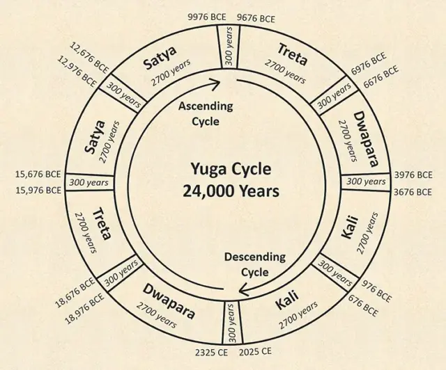 - Der vollständige Yuga-Zyklus dauert 24.000 Jahre und besteht aus einem aufsteigenden Zyklus von 12.000 Jahren, in dem das menschliche Bewusstsein zusammen mit unserer Lebensspanne und Körpergröße allmählich zunimmt, gefolgt von einem absteigenden Zyklus von 12.000 Jahren, in dem diese Eigenschaften allmählich abnehmen.