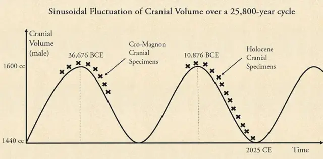 Ich behaupte jedoch, dass Darwins Theorie der linearen Evolution grundlegend falsch ist und dass unsere Körpergröße und unser Schädelvolumen in Wirklichkeit sinusförmig im Verlauf des 25.800-jährigen Präzessionszyklus, auch Yuga-Zyklus genannt, schwanken. Aus diesem Grund datieren die Schädelfunde der Cro-Magnon-Menschen, deren Schädelvolumen dem unserer Vorfahren aus dem Goldenen Zeitalter ähnelte, genau auf den Höhepunkt eines früheren Goldenen Zeitalters um 36.676 v. Chr.!