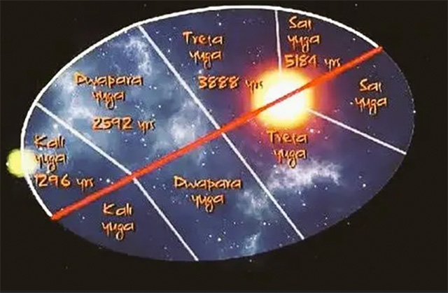- Jeder 12.000-jährige Halbzyklus besteht aus vier Yugas von jeweils 3.000 Jahren Dauer. Die eigentliche Dauer eines Yuga beträgt 2.700 Jahre, gefolgt von einer Übergangszeit von 300 Jahren, bevor sich die Eigenschaften des nachfolgenden Yuga manifestieren. Der Yuga-Zyklus wurde anhand des „Kalenders der Sieben Weisen“ oder „Saptarshi-Kalenders“ des alten Indiens verfolgt, dessen 2.700-jähriger Zyklus als „Saptarshi Yuga“ bezeichnet wird.