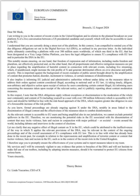 Urgent letter to @elonmusk on #DSA obligations ⤵️ pic.twitter.com/avMm1LHq54