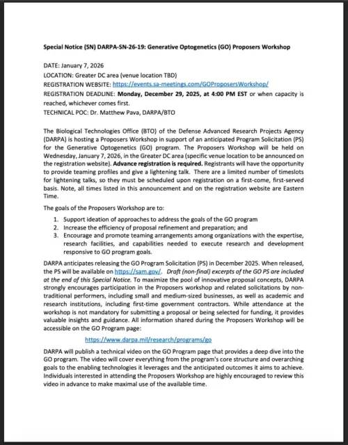 In Entwürfen von Ausschreibungsunterlagen, die auf SAM.gov veröffentlicht sind , beschreibt DARPA GO als ein Vorhaben, das den „massenlosen Informationstransfer“ genetischer Anweisungen ermöglichen und eine direkte Schnittstelle zwischen Computern und lebenden Zellen herstellen soll.