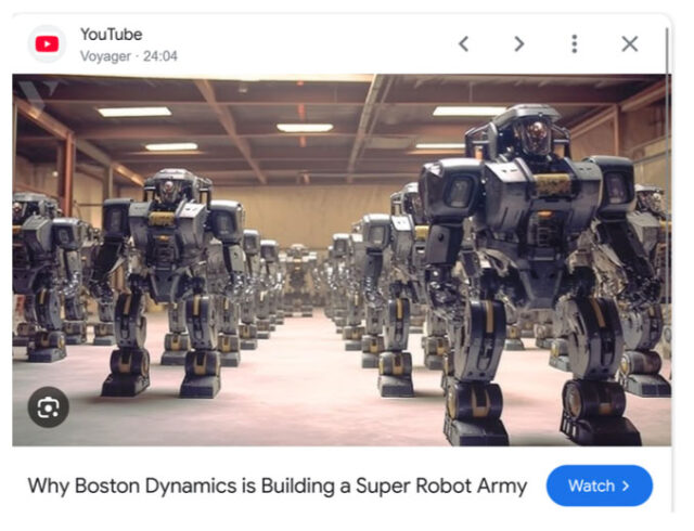 Man würde nie erraten, wem Boston Dynamics gehörte. Google! Wenn Google nicht bereits ein militärisches Instrument gewesen wäre, warum sollte die Regierung ihnen erlauben, eine Roboterarmee zu entwickeln?