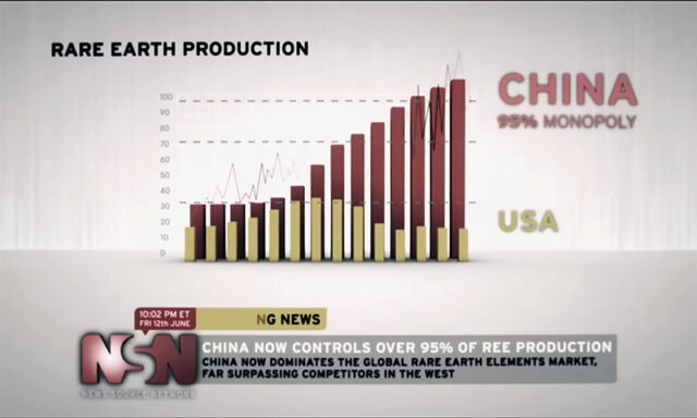 Die obige Grafik ist fiktiv und stammt aus einem Videospiel von 2012, das in der nahen Zukunft spielt. Hier ist eine Grafik zur tatsächlichen Seltene-Erden-Produktion der letzten Jahre.