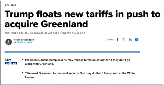 Eine Schlagzeile aus dem Jahr 2026, die besagt, dass die Vereinigten Staaten aus Gründen der nationalen Sicherheit die Kontrolle über Grönland übernehmen müssen.