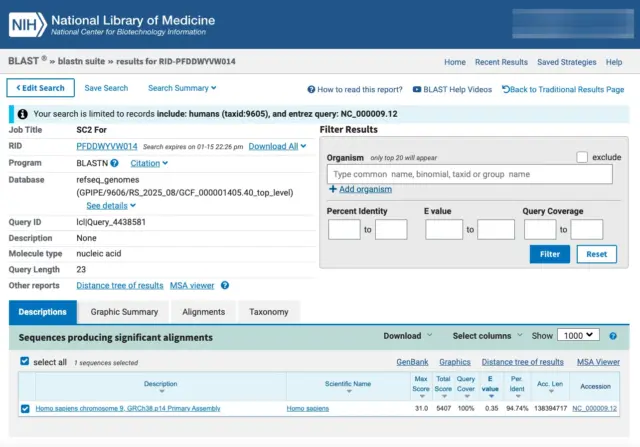 Die Ergebnisse zeigen, dass der Primer mehrere perfekte und nahezu perfekte Übereinstimmungen mit dem menschlichen Genom aufweist, darunter: