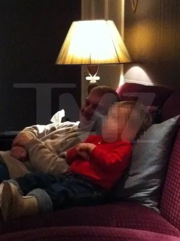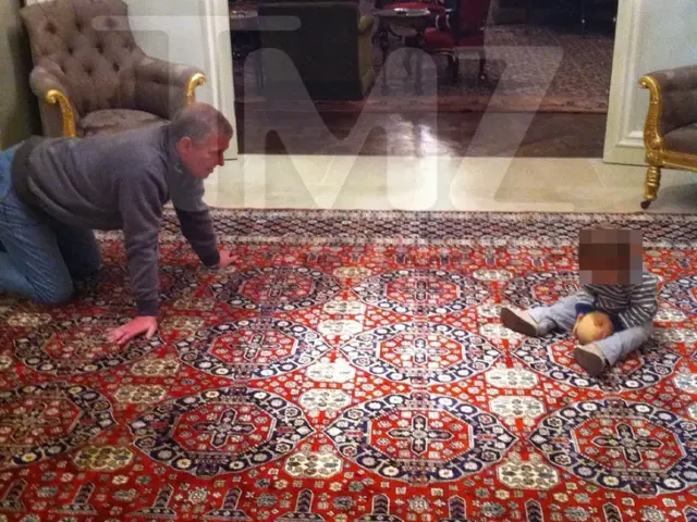 Auf mehreren Fotos spielt der Junge scheinbar mit einem Ball in Form einer Brust, während Andrew in der Nähe auf einem Teppich krabbelt. Ein weiteres Bild zeigt die beiden zusammen auf einem Sofa sitzend.