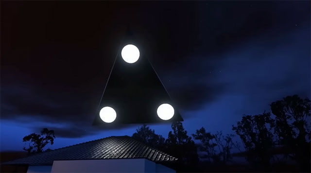 Als die beiden in den Nachthimmel blickte, fiel ihnen ein seltsamer Stern auf, der dort irgendwie nicht hin passte. Er wurde größer, schien näher zu kommen – erst da bemerkten das Pärchen, dass es kein Stern war, sondern ein pechschwarzes, riesiges gleichschenkliges Dreieck mit drei hell erleuchteten Lichtern an jeder Ecke.
