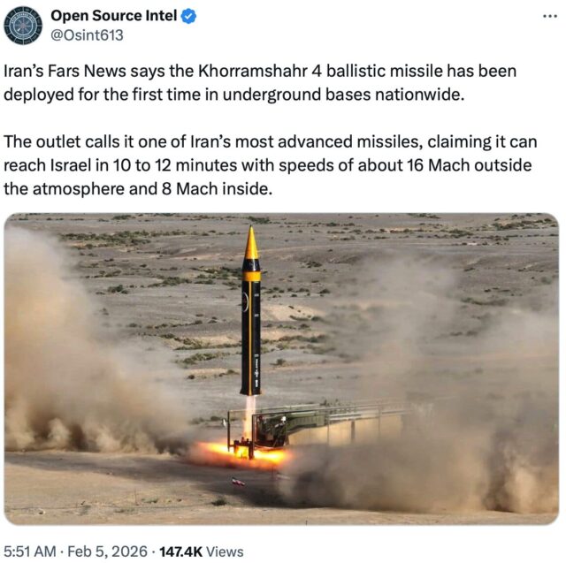Der staatliche iranische Fernsehsender Press TV gab bekannt, dass der Iran am Donnerstag seine „modernste ballistische Langstreckenrakete“, die Khorramshahr 4, in einer der unterirdischen „Raketenstädte“ der Islamischen Revolutionsgarde (IRGC) stationiert hat.