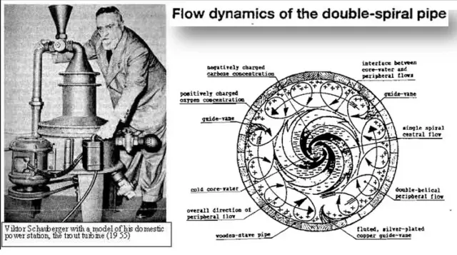 Aus seinen Visionen wusste er, dass sich Wasser durch seine Mäanderbewegung mit einer natürlichen Form von Magnetismus auflädt. Diese magnetische Kraft zieht die Wassermoleküle zusammen, wodurch das Wasser dichter und leichter wird.
