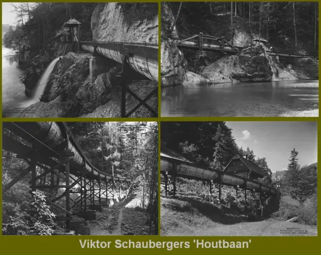 Die Vorrichtung, die den Förster über Nacht berühmt machte, war die sogenannte „Holzbahn“ von 1924. Ein künstlicher Bach, mit dem Schauberger die Transportkosten für gefälltes Holz auf ein Zehntel reduzierte. Auf seine unnachahmliche Art ließ er schwere, bis zu 60 cm dicke Baumstämme auf einer nur 20 cm tiefen Schicht „implozierten“ Wassers schwimmen.