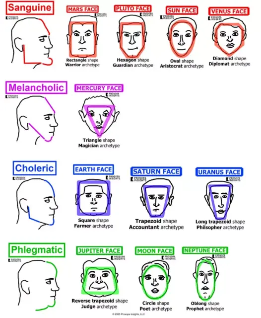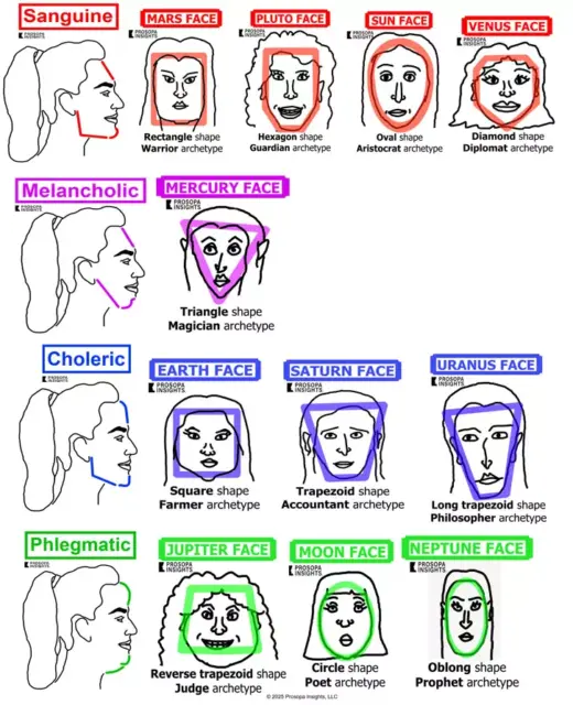 Er beschrieb mehrere Archetypen: Mars, rechteckig mit markantem Kinn und hoher Stirn, steht für Aggression und Führungsstärke; Merkur, dreieckig und spitz zulaufend, mit Witz und Sensibilität; Jupiter, breit und voll, für Fröhlichkeit und moralische Überzeugung; und Neptun, lang und schmal, für Spiritualität und Tiefgründigkeit.