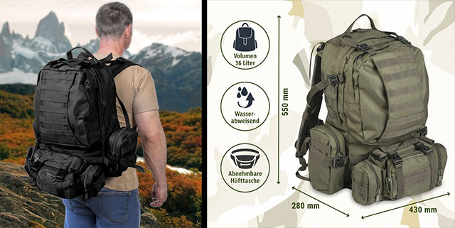 – diverse Molle-Aufnahme-Schlaufen an Rucksack, Seitentaschen und Hüfttasche