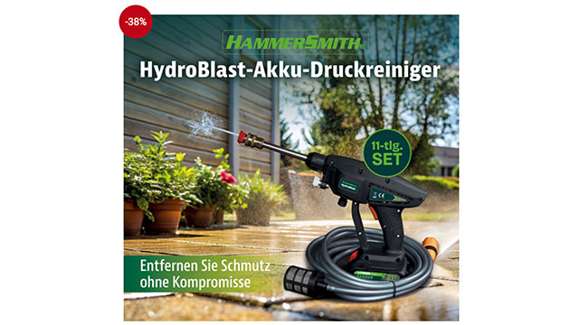 Herkömmliche Druckreiniger sind oft sperrig, kabelgebunden, teuer und verbrauchen viel Strom. Die Lösung: der Hammersmith® HydroBlast-Akku-Druckreiniger. Dieses kompakte und leichte Handgerät wiegt nur 1,4 Kilogramm.