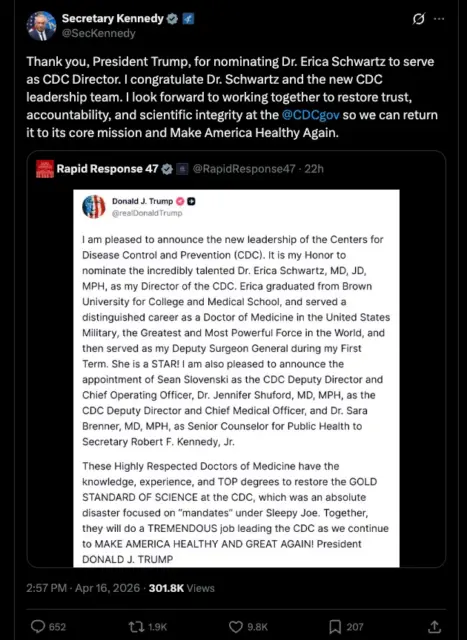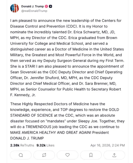 Präsident Donald Trump hat Dr. Erica Schwartz – eine beim Militär ausgebildete Architektin von Systemen zur Überwachung, Impfung und Einhaltung der Vorschriften bei Grippepandemien – zur Leiterin der Centers for Disease Control and Prevention (CDC) ernannt und damit eine Expertin für Grippesysteme an die Spitze des nationalen öffentlichen Gesundheitsapparates befördert.